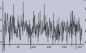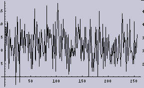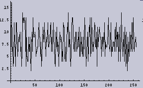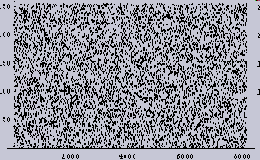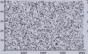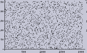 まず、2048個の[ランダムに0から256の値を持つもの]からなる1次元データを作成する。以下の左図がそのデータである。ここで、X軸がデータの順番であり、1から2048までを示し、Y軸がデータの値である。Y軸の数値ラベルは0から256の値である。折れ線グラフの方が1次元データとして実感できるのだが、そうすると真っ黒になってしまうので、点プロットグラフにしてある。