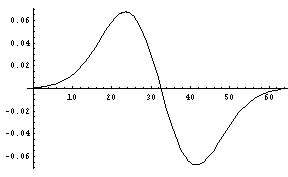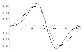 それでは、今回の方法による一階微分の結果と、それと解析解との比較を示す。なお、本来無限領域のフーリエ変換を有限の領域で行っているため、端部近くで変なことが生じるのはしかたがないだろう。また、色々な事情により係数の違いは無視して欲しい。