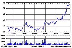 一見似ているように思える。しかし、よく見てみると軸が違っている。左のAppleComputerの株価変動は対数軸で表されている。「株価表示グラフで値の軸を対数軸にできないか」という言葉が頭にあったせいで気づいたわけだ。そこで、この違いが新鮮で「今日の必ずトクする一言」のwebmaster氏への返信に至ったわけである。