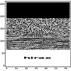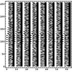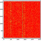 横方向の1ライン分を一区画と考える。ハードディスクならセクタといったところか。その区画内でのヒストグラムを計算すると以下のようになる。この図では横方向が0から255までの存在量を示し、縦方向は区画を示している。