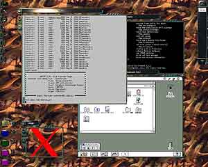 さて、私もMacintoshでMkLinuxを使っている。MkLinuxはPPCLinuxへと変化してしまったが、私の環境は未だにMkLinuxDR2.1update4+sharedLib。そもそも、sharedLib化したのもenlightenmentを動作させるためであった。というわけで、WindowManagerをKyon^2と同じenlightenmentにした際の画面が以下である。ターミナルはもちろんkterm。