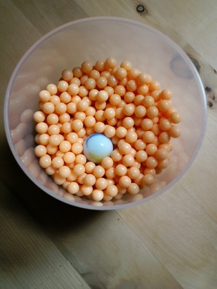 というわけで、グラスに柿ピーをザーッと注ぎ入れてみました。この状態で、グラスの中を覗いてみると、柿の種の中にたまにピーナッツが顔を出しているという程度で、比較的、ピーナッツの存在分布は内側に多いかな、という程度です(ちなみに、袋の中にある柿の種とピーナッツの割合はこんな感じです)。
