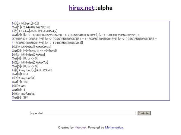 この状態で、ためしにブラウザを立ち上げてhttp://localhost/にアクセスしてみましょう(たとえば、80番ポートで立ち上げたのでなく、81番ポートで立ち上げたのであれば、http://localhost:81/にアクセスしてみましょう。すると、ブラウザ上で下のスクリーンショットのような画面が現れ、あなたのブラウザ上でMathematicaを使うことができるようになります。入力も出力も、通常のMathematicaと同じような(似たような)画面構成ですから、Mathematicaを使ったことがある方であれば、簡単に使うことができると思います。