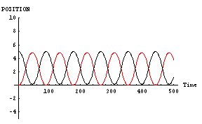 また、二人の「魅力」や「優柔不断度」は対等である場合だ。その結果を下に示す。このグラフは縦軸が空間位置であり、横軸が時間である。黒線が「男」であり、赤線が「女」である。