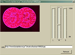 でやったL,M,Sの各錐体の感度が低いときの色覚シミュレーションを行うソフトを作成してみた。ソフトはこれである。前回と同じく、Susieプラグインを用いて画像を読み込んでいるので、「Susieの部屋」などから、Susie本体・あるいはプラグインを入手する必要がある。また、手間を惜しんだためProxy対応にはしていない。さて、動作画面サンプルを以下に示す。初期状態では