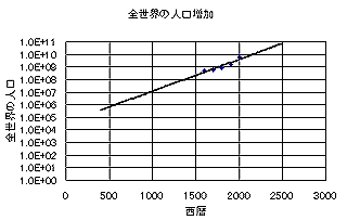 また、世界の人口は人口増加に示されている全世界の人口増加の様子を見れば明らかなように爆発的に増えている。ちなみに、そこに示されているグラフを対数軸にし、近似式を加えたものが以下である。