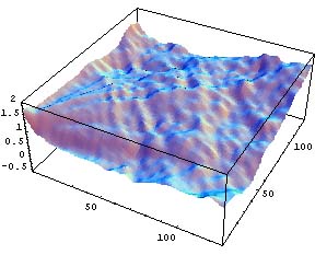 そこで、まずは手っ取り早くMathematicaでフラクタル地形を作成してみた。次のアニメーションGIF画像はMathematicaでフラクタル地形を作成していく様子である。荒いスケールの凹凸を作成して、その後段段と細かいスケールの凹凸を作成していくようにしてみた。プログラム時間は10分である。ここらへんの手軽さがMathematicaのスゴイ所だ。