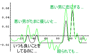 まぁ、じっくり物を考えないA子はおておいて、それではB子はどうだろうか?きっと、C男と上手くいくだろうB子はどうだろうか?もちろん、「人の良い」C男を選んでくれるだろう。というわけで、次のグラフが、A子とB子のD男に対する「恋する心」を比較したものである。緑字がA子のD男に対する「恋する心」を示し、黒字がB子のそれを示している。