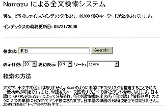 もちろん、infoseekなどにも登録はしてあるから、ある程度の内容を検索することはできるのだが、残念ながらそれほど詳しい検索はできない。自分でも不便に思っていたこともあるし、この「できるかな?」を書き始めるきっかけを作って下さった方からアドヴァイスされたこともあり、、全文検索システム"namazu"をhirax.netにインストールしてみることにした。