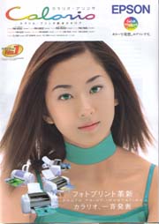ナルホド、確かにエメラルドグリーンというような色の辺りでPM900Cには出力できるけど(少なくともICCファイル上は)、sRGB・F870にはその色は出せないという領域もあるようである。そして、さっきのパンフレットをもう一度眺めてみると、確かにその色をパンフレットのメインの色としてあしらっていることがよくわかるだろう(ホントかいな?)。このエメラルドグリーンの服は伊達ではないのである。黒ずくめの男を表紙に使ってるのとは大違いの素晴らしさである。