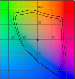 この結果を見ると、確かに若干ではあるがPM900Cの方がF870よりも出力できるab色平面が広いように見える。といっても、この図では見づらいと思うので、この二つを重ねて、