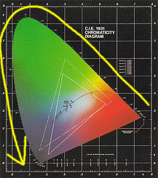 この図中に、とあるCRTとプリンターの出力可能な色空間(CCMファイル中に埋め込まれているプロファイル情報を参考にしたもの)を白点線と白実線で示したが、とても狭い領域の色しか出せず、とてもじゃないが虹の中に見えるスペクトル色はこれらの機器では出ないことが判るだろう。