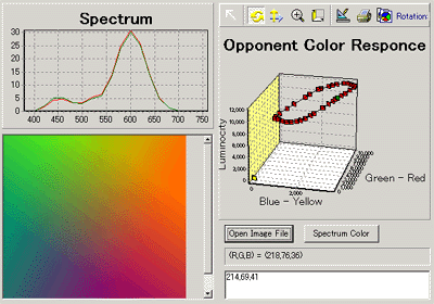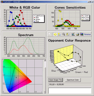 左上から下に向かって、RGBそれぞれのスペクトル設定、全体でのスペクトル、読み込んだ画像、右上から、錐体の分光感度、反対色応答の出力値である。