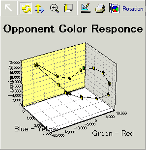 さっそく、赤→黄色→緑→青→紫というスペクトル色の反対色応答「モドキ」を見てみたのが次のグラフである。縦軸が「輝度チャンネル」で、向かって左の軸が「青<->黄」チャンネルで、向かって右の軸が「赤<->緑」チャンネルである。この「輝度チャンネル」・「青<->黄」・「赤<->緑」という「感覚的」3次元空間で波長が一方向に変化するスペクトル色を連続的にプロットしてみると、見事に円状につながっていることが判る。「赤<->緑」チャンネルの計算が基本的にはL錐体出力からM錐体出力の差分をとって、さらにS錐体の出力をほんの少しだけ引いてやるという計算をしているため、短波長側でL錐体の感度がM錐体の感度を上回っている(ように実は設定した)のでこんな風になるのだ。単純に波長が短くなるだけなのに、見た感じ何故か紫と赤が近く見える。あくまで、大雑把な話だけれど。