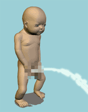 下のちょっとリアルな「しょんべん小僧」の放水作業ではないが、小便の軌跡はきれいな放物線を描く。