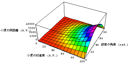a V0^2 Sin[2θ] (aは定数)と表される。この式を見ればθ = 1/2 rad.の時にSin[2θ]が1になるので一目瞭然であるし、また感覚的にも自然であるが、銃筒の角度の方は上向き45度の角度に向けるときに小便の飛距離は最大になる。一方、初速度V0の方は速ければ速いほど、小便の飛距離は伸びる。