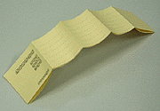 というわけで、作ってみたのがこの「できるかな?」特製「落書き紙」である。折り畳んだ状態は三浦折り特有のちょっと不思議な重なり方になり、見た感じのデザインも割に良い感じだと思う。そして、これが「できるかな?」特製「落書き紙」折り畳みのようすである。