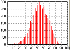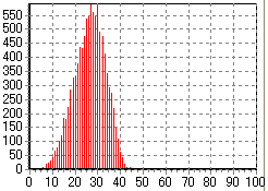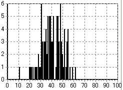 そんなわけで、下に示すのが「何回目でビンゴになるか一万回試行したときのモンテカルロシミュレーションを行ってみた結果」である。実際にビンゴ大会を一万回したらものスゴイ時間がかかるが、PCの中だったら一瞬ですむのが素晴らしいところである。ちなみに、ビンゴのシートの条件は、シートに書かれている数字が