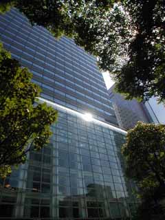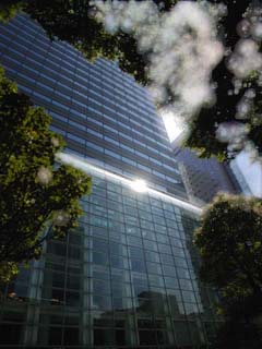 そして、また下の写真は、新宿から初台へ歩く途中で眺めた木漏れ日の向こうのビルの景色だ。左のオリジナル写真はクッキリ・ハッキリ写っているのだが、ただ「それだけ」である。太陽の光を遮る木々の葉っぱも、そこから降り注ぐキラキラする木漏れ日も写ってはいない。しかし、右のRINgが描いた景色の方では、ボンヤリと、だけど強く光る初夏の「木漏れ日」が確かに写っているのである。夏の空気が写っているかのようなのだ。