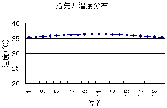 アマノジャクに上がり湯を浴びなかった場合は、指先が一様に冷えてしまっているのに対し、素直に上がり湯を浴びた場合には皮膚表面の温度は下がってしまっているが、冷えているのは指の表面近くの脂肪の部分だけで、筋肉も含めた指の芯は以前ホカホカ・アッチッチのままなのである。脂肪は筋肉に対して熱を伝えにくいので、表面の脂肪部分が冷たくても、その内部はずっとアッチッチのままなのである。