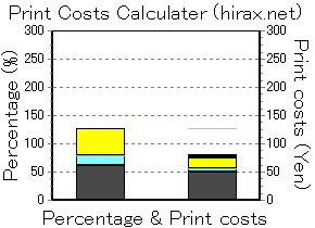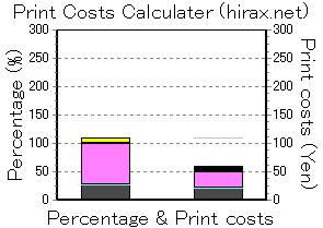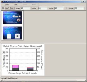 というわけで、「プリント・お値段鑑定団」ソフトウェアというものを作ってみた。これは、画像ファイルを読み込んで、その画像を出力したときに、どの位インクを使うかを調べ、それを出力した時の大体の値段を計算してくれるものなのである。例えば、PowerPointからTIFFファイルに印刷結果を出力するTIFFプリントドライバーや、Bitmapファイルに印刷結果を出力するBitmapプリントドライバー、あるいは、PDFプリントドライバー+PDF2BMPのようなもので、前もって印刷画像を画像ファイルにしてみて、それを読み込んで、カタログに記載されているインクや紙の値段を設定すれば、「これを印刷するとお勘定はこの位になります」と教えてくれるわけなのである。