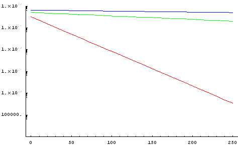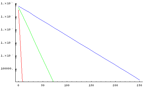 ということを毎日続けていくと、秘伝の壷の中に漂う「江戸時代にできたタレの分子数」はどうなるか、を計算してみたのである。まずは、毎日100人のお客が鰻を食べに来るような人気の鰻屋の場合である。また、壷の容量は特大と三種類の場合で計算してみた。下に示すグラフがその結果で、横軸は創業以来の「壷」の経過年数、縦軸は壷の中に入っている「江戸時代の頃にできたタレ」の分子数を示している。
