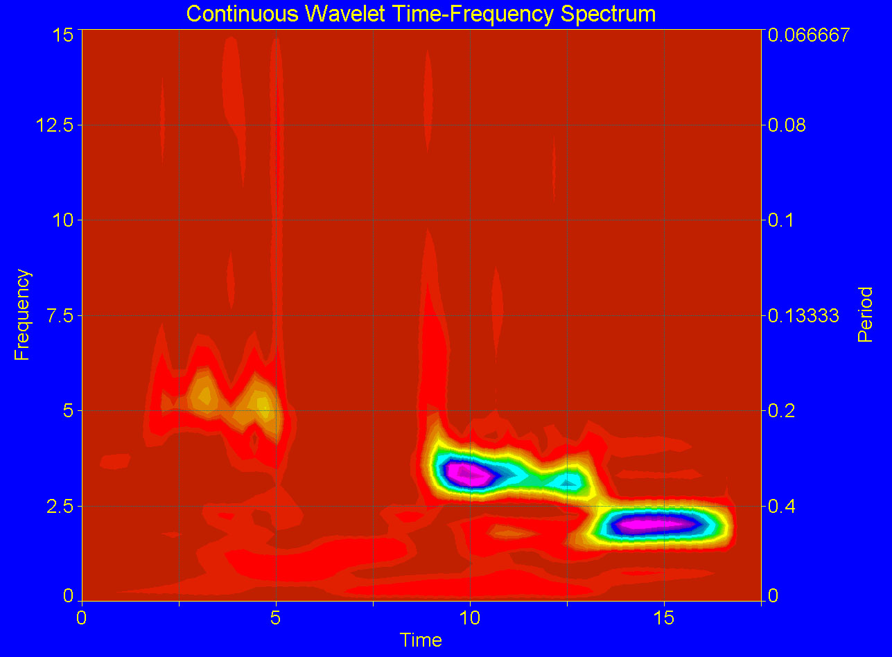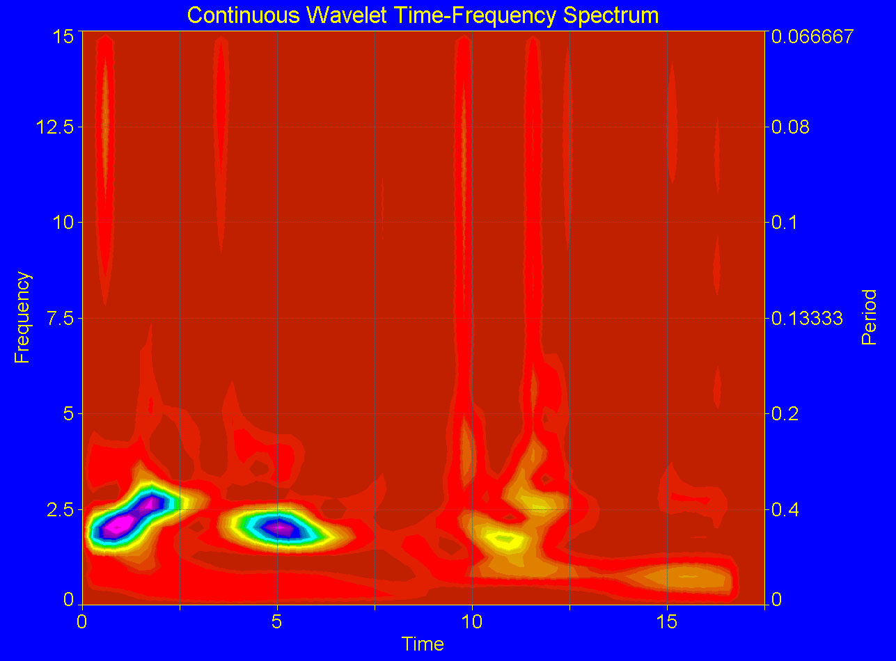 というわけで、下に示すグラフは横軸が約15秒間の時間を示している。そして、縦軸は生じている振動の周波数を示し、色はその周波数の信号の強度を示している。つまり、時間をおってどんな周期の振動が生じているかを示したグラフなのである。