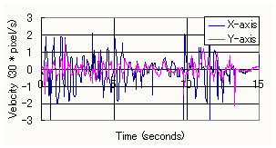 材料が揃ったところで、さっそくアダルトビデオの画面の中のモノたち(つまりは俳優達だ)がどんな風に動いているかを解析するソフトウェアを作ってみた。いや、もちろんアダルトビデオでなくても構わないし、もちろん男優と女優達でなくても構わないわけであるが、今日のお題は「アダルトビデオの科学」であるわけだから、アダルトビデオの中の俳優達が画面がどんな風に動いているのかを解析するソフトを作ってみたのである。そして、とりあえず各15秒のアダルトビデオ二本における横揺れ縦揺れ速度の変化を解析してみた結果がしたのグラフである。青い線が横方向の揺れの速度で、紫色の線が縦方向の速度になる。