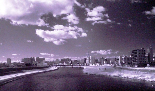 というわけで、上の写真が散歩の途中で撮った写真です。左が可視光で眺めた景色で、右が赤外線で眺めた景色です。赤外線で眺めると、上空の青空は暗くなり、暗い空に雲が輝いています。また、その一方地上では、葉緑素(クロロフィル)は赤外線を強く反射するので、木々の葉は眩しく輝いています。まるで、白い綿菓子をまとっているかのようです。