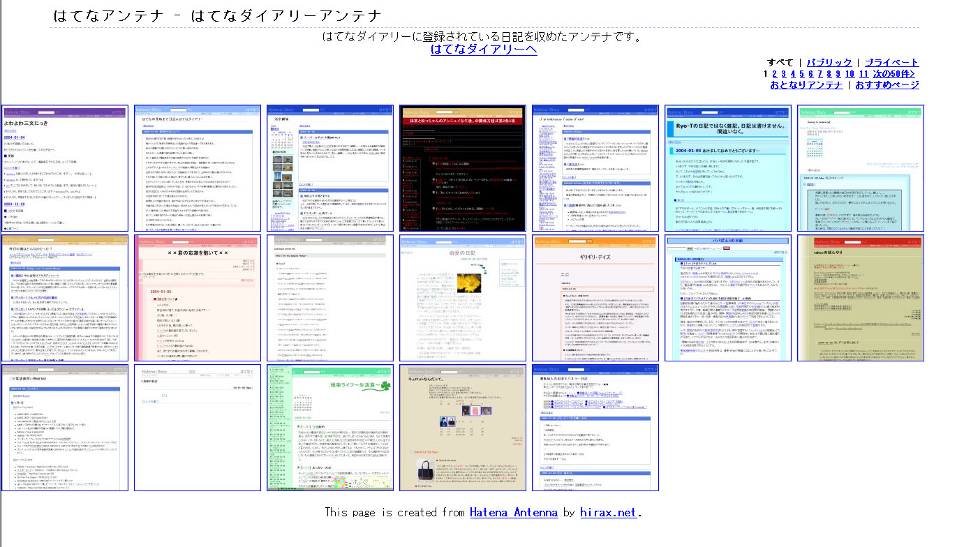 http://www.hirax.net/hatena.cgi?uri=http://a.hatena.ne.jp/hatenadiary/という感じで、「はてなアンテナ」のアドレスを受け取って、それをサムネイルバージョンに書き換えているだけ、です。サイト・リストのデータベースが鍛えられるまでは、気長にレンダリングが終了するのを待って下さいな、と。その待ち時間の間にも働き者のPCがガリガリレンダリングをしているわけですからね。
