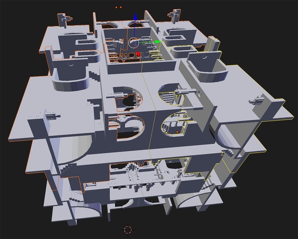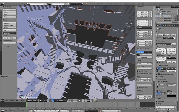 だとしたら、エッシャーの非現実かつ現実的な世界に360度全天周で入り込むことができればとても興味深いはず!というわけで、今朝は、幾何学的に無矛盾な "Relativity" を全天周で眺める準備をしてみた。幾何学的に無矛盾というのは、四方に配置された階段や壁は、そこに佇む人の向きが無重力で不思議なだけで、3次元空間的に特に不思議なところがあるわけではない、という意味だ。
