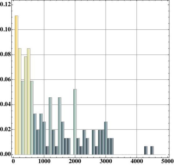 去年2012年分について、レシートを元にして「買い物時にレジで支払った金額」の頻度分布を描いてみました。横軸が「円(レジで支払った総額)」で縦軸が頻度(比率)です。