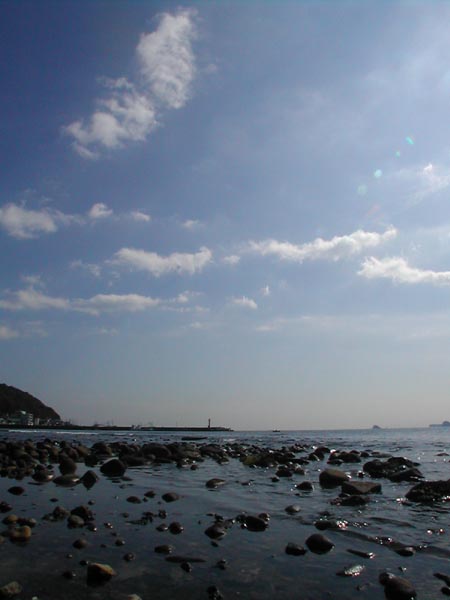 カメラ付き携帯、というより、携帯付きのカメラで眺めた今日見た景色。これが今日見た青い空。海の向こうや水たまりの向こうの青空の写真。