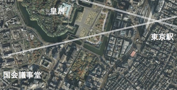 国会議事堂を地図上でよくよく眺めてみると、南北東西の方角から少しズレていることがわかります。国会議事堂の入り口は真東ではなく少し北寄りを向いていますし、参議院も北側というより北北西に位置しています。…ということは、玉座は完全には南面(南を向く)していないということになります。一体なぜなのでしょう?