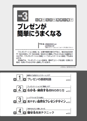 3月23日に発売されるLife Hacks PRESS 〜デジタル世代の「カイゼン」術〜に25ページほどの「プレゼンが簡単にうまくなる」という原稿を書きました。書かれている内容は…右のサムネイル画像をクリックしてみると大雑把にわかるかと思います。