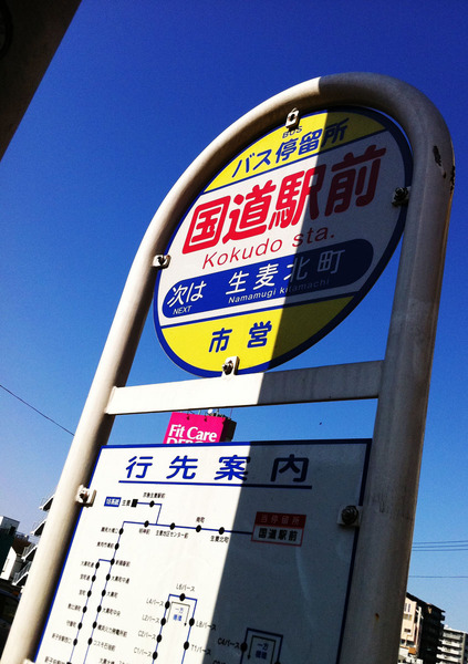 「高周波前」という理系心をくすぐる、けれど奇妙奇天烈な名前のバス停を目にしてから、変な名を持つ色々なバス停を眺めたくなりました。そんなわけで、先日眺めに行ったバス停は「国道駅前」という名を持つバス停です。もう少し正確に書けば、「市営バス停・国道駅前」という名前で、一体「市」なのか「国」なのか、バスなの(普通の)車両なのか列車なのか、道なのか駅なのか…その辺りを実に煙に巻く不思議な名前を持つバス停なのです。