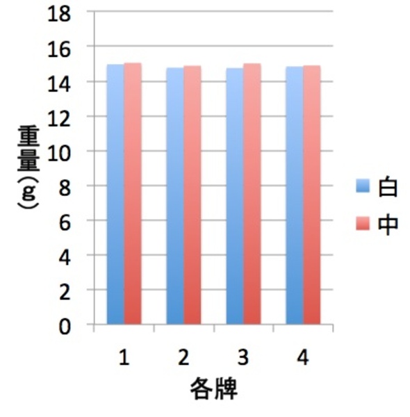 そこで、白牌と中牌、つまり全く絵柄を削りだしていない「重そうな牌」と「文字が大きく彫られている(=重さが減っていそうな)牌」の重量を量ってみました。