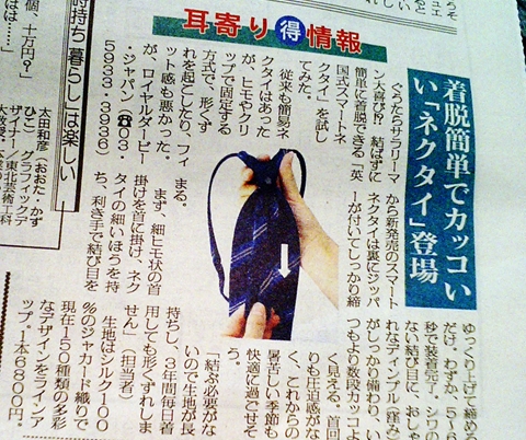 ネクタイをたま〜に着ける。そんな時に便利そうな、簡単ネクタイ「英国式スマートネクタイ」の広告を見た。一つ買ってみようかな。何て言ったって、「英国式スマートネクタイ」なんだもの。これで、働く男の魅力が手に入る…かも。