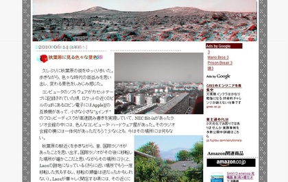 立体表示のブログシステムをやってみたい、と時折思います。バナー画像も、使われているイラストも、もちろん、文章も適切に立体処理されている、というものです。イメージ図を適当に描いてみると、下のような具合です。右目にシアン(青+緑)・右目に赤色の赤青メガネをかけて眺めてみれば、立体的に見えることがわかると思います(この画像-記事-はRSSリーダーでなく、ブログ本体から眺めると面白いと思います)。