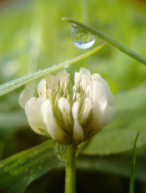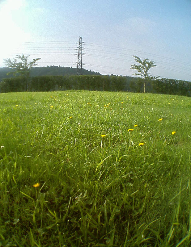 朝早くの駐車場。芝生の中でじっと屈んで撮ってみる。水滴は小さな小さな魚眼レンズになる。カメラ付きの携帯電話で、水滴を眺めると、水滴でできた魚眼レンズの向こうにはさらに世界が広がっている。