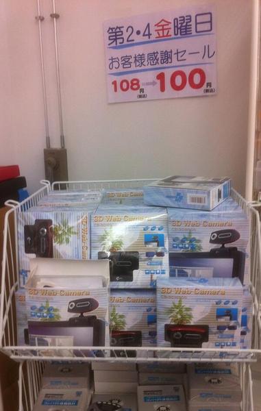 台風が過ぎたばかりの週末に、昔住んでいたあたりに行ってみることにした。台風が過ぎたことを確認して西伊豆方面に向かい、目的地の近くに辿り着いたあたりで100円ショップを見かけたので、その店に思わず入ってみました。…意外なほどに広い店内を眺めてみると、「3D WEBカメラ 」が置いてあります。しかも、ひと月に2回チャンスの第2・第4金曜日限定の全商品(通常価格100円+消費税8円)を消費税込み100円ポッキリフェアをやっています。というわけで、思わず3Dウェブカムを4個あまり買ってしまいました。