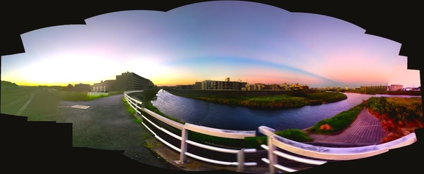 7月17日の19時頃、東横線の綱島駅近くの川沿いで夕焼けを見上げていると、西の空と東の空を真っ直ぐ結ぶように、夕焼け空に蒼い力強く太い線が走っています。その線の起点、西の端を見ると、丹沢山地の彼方に夕日が沈もうとしています。そして、もう一端は東京湾の向こう・東北の空に向かい伸びています。そんな景色が、下に貼り付けた写真です。左の端が西の空で、北に向かって景色を眺めていて、右の端が東の空です。