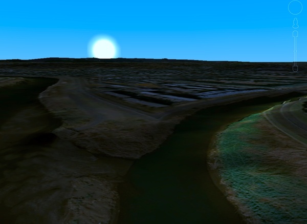 夕暮れちょうどの時間でしたから(右上に貼り付けた画像が、google Earth上で、その日・その時間・その場所から眺めた夕日の方向の景色です)、西から水平方向に差し込む赤い夕日の光を、空に浮かぶ雲が(あるいは、どこかの山が)遮ることで、こんな蒼く暗い影が空に形作られたのでしょうか。
