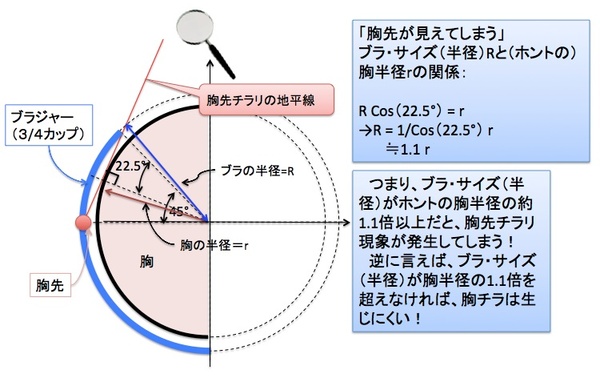 というわけで、今回は単純な算数(数学)を使い「胸先チラリ…」の幾何学を考えてみました。数学的に導き出された結果は、胸先チラリ条件が生じるのは「ほぼBカップ以下の小胸さんに限られる!」という「なるほど、確かにそうかも!」という答えでした。
