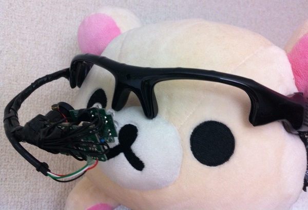 というわけで、頭部の向き・眺める景色を逐次記録しつつ、それと同時に、その景色の中のどの部分を眺めているかを計測する「視線追跡機能付きメガネ」を作ってみました。右の写真は、快く協力して頂いたモデルのリラクマさんと、開発&製造途中の「電脳DIYメガネ」です。