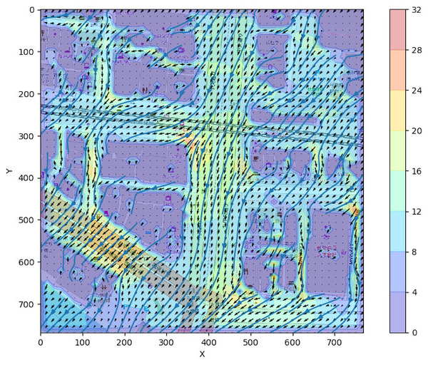 そこで、リアルタイムの気象状況を反映した「(仮称)ビル風☆どこでも見えるマップ」を作ってみることにしました。具体的には、自分のいる場所(や指定した場所)の、地表近く風速をOpenWeatherMapサービスから取得した上で、地図情報を構築しているOpenStreeMapから建物情報を得た上で、さらに非圧縮流体計算を行って、自分が知りたい街並み周りの空気流を可視化するサービスです。…下に貼り付けた動画は、秋葉原から神田にかけての場所で計算させた結果をブラウザで眺めたビジュアリゼーション例です。