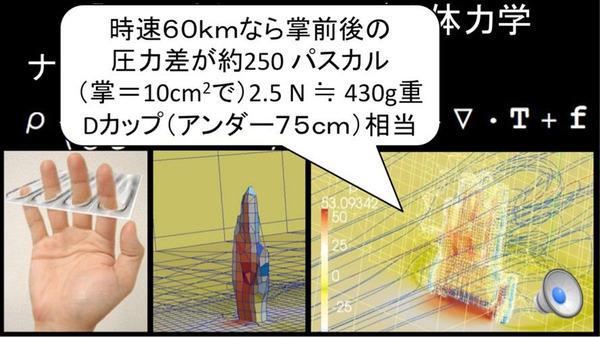 感触は風速のおよそ2乗に比例します。そして、その風速と疑似オッパイの重み・感触の対応関係は、流体計算をすることで、時速60kmの風は430g重相当だという計算がされています(参考:「時速60kmの風」は「アンダー85cm Cカップを1.3mm押し込む感触」で「ウィダーゼリーの重さ」とほぼ同じ!?という法則…ただし、計算結果が若干違っていて、正確にはDカップ相当です)。そこで、この関係を使うと、一体何カップが風速何メートル相当かを計算することができるのです。
