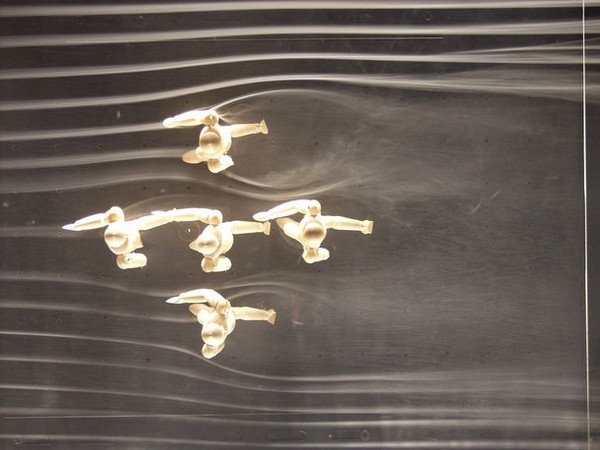 マラソン競技のペースメーカ配置が適切であれば、空気抵抗の減少により4分30秒ほどの体力温存効果がある、という「ペース・メーカ配置と走者周りの気流」 走者たちの周りの気流を眺めていると、時速20kmという速さを実感できるかも。