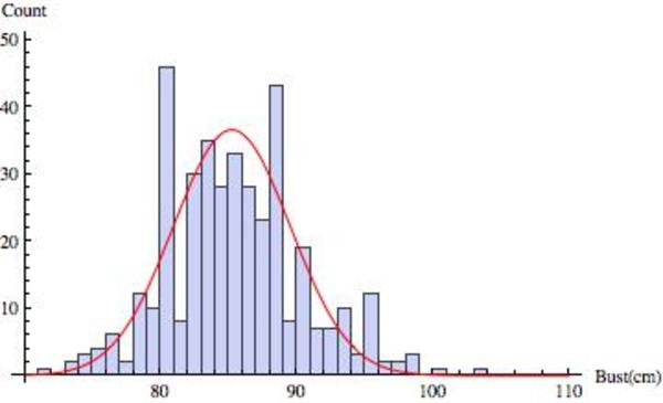 すると、少し不自然なピークがあることに気づきます。たとえば、ウェスト(cm)なら、奇妙に不自然に58cmに大きなピークがそびえています。あるいは、バスト(cm)であれば、80cmや88cmが不思議なほど数が多くなっています。 …これは、たぶん本当の数字ではないのでしょう。