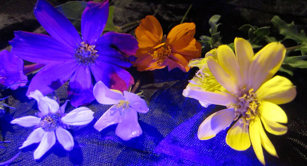 紫外線カメラで眺めるなら、せっかくなので「昆虫が普段眺めていそうなもの」として、川沿いに咲いていた花を摘んで撮影してみたのが下の写真です。左の写真がが可視光のカラー画像、右が紫外線撮影したものです。紫外線で眺めてみると、同じような色に見えても、花びらと花の中心部の明るさが全く異なっていたりして面白くなります。またあるいは、可視光では暗く沈んだ赤色に見えていた花が紫外線の世界では明るく輝いていたり、生き生きとした明るい橙色の花が紫外線では全く見えない暗黒のような花だったり…と意外で面白く感じます。